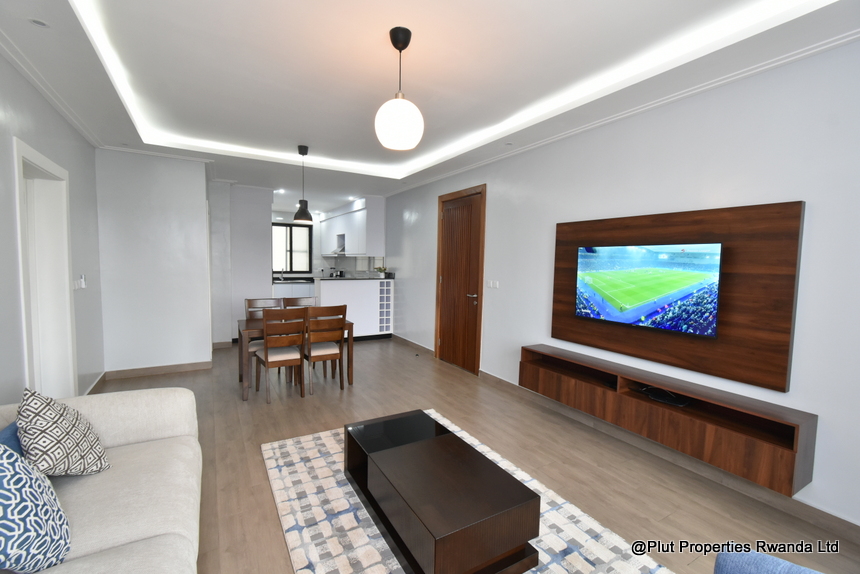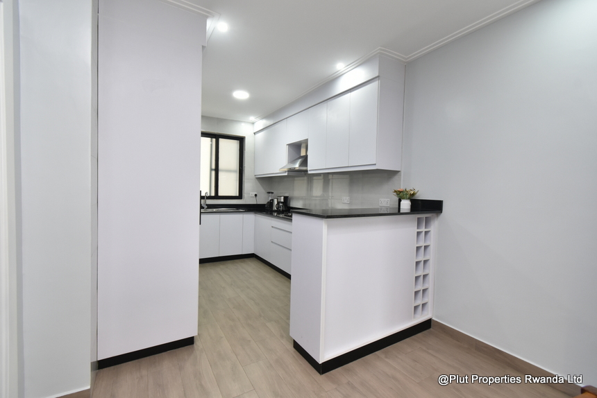 Inside, the apartment is fully self-contained and includes a well-fitted kitchen, tastefully equipped for everyday cooking. The open, elegant living and dining area is designed for comfort, making it ideal for families, diplomats, and professionals seeking short-term accommodation in Kacyiru.